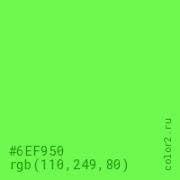 Цвет #6EF950 в цветовой модели RGB обозначается тремя октетами (110, 249, 80) в десятичном формате и #6EF950 в шестнадцатиричном (hex) формате, которые являются интенсивностью красного 110 (hex 6E), интенсивность зелёного 249 (hex F9) и интенсивность синего 80 (hex 50).