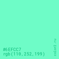 Цвет #6EFCC7 в цветовой модели RGB обозначается тремя октетами (110, 252, 199) в десятичном формате и #6EFCC7 в шестнадцатиричном (hex) формате, которые являются интенсивностью красного 110 (hex 6E), интенсивность зелёного 252 (hex FC) и интенсивность синего 199 (hex C7).