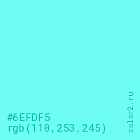 Цвет #6EFDF5 в цветовой модели RGB обозначается тремя октетами (110, 253, 245) в десятичном формате и #6EFDF5 в шестнадцатиричном (hex) формате, которые являются интенсивностью красного 110 (hex 6E), интенсивность зелёного 253 (hex FD) и интенсивность синего 245 (hex F5).