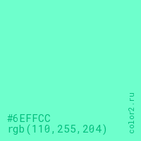 Цвет #6EFFCC в цветовой модели RGB обозначается тремя октетами (110, 255, 204) в десятичном формате и #6EFFCC в шестнадцатиричном (hex) формате, которые являются интенсивностью красного 110 (hex 6E), интенсивность зелёного 255 (hex FF) и интенсивность синего 204 (hex CC).