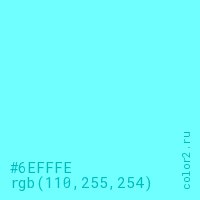 Цвет #6EFFFE в цветовой модели RGB обозначается тремя октетами (110, 255, 254) в десятичном формате и #6EFFFE в шестнадцатиричном (hex) формате, которые являются интенсивностью красного 110 (hex 6E), интенсивность зелёного 255 (hex FF) и интенсивность синего 254 (hex FE).