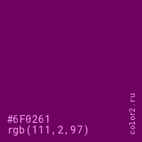 Цвет #6F0261 в цветовой модели RGB обозначается тремя октетами (111, 2, 97) в десятичном формате и #6F0261 в шестнадцатиричном (hex) формате, которые являются интенсивностью красного 111 (hex 6F), интенсивность зелёного 2 (hex 02) и интенсивность синего 97 (hex 61).