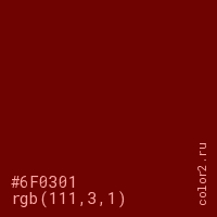Цвет #6F0301 в цветовой модели RGB обозначается тремя октетами (111, 3, 1) в десятичном формате и #6F0301 в шестнадцатиричном (hex) формате, которые являются интенсивностью красного 111 (hex 6F), интенсивность зелёного 3 (hex 03) и интенсивность синего 1 (hex 01).
