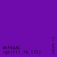 Цвет #6F0AAC в цветовой модели RGB обозначается тремя октетами (111, 10, 172) в десятичном формате и #6F0AAC в шестнадцатиричном (hex) формате, которые являются интенсивностью красного 111 (hex 6F), интенсивность зелёного 10 (hex 0A) и интенсивность синего 172 (hex AC).