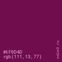 Цвет #6F0D4D в цветовой модели RGB обозначается тремя октетами (111, 13, 77) в десятичном формате и #6F0D4D в шестнадцатиричном (hex) формате, которые являются интенсивностью красного 111 (hex 6F), интенсивность зелёного 13 (hex 0D) и интенсивность синего 77 (hex 4D).