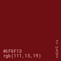 Цвет #6F0F13 в цветовой модели RGB обозначается тремя октетами (111, 15, 19) в десятичном формате и #6F0F13 в шестнадцатиричном (hex) формате, которые являются интенсивностью красного 111 (hex 6F), интенсивность зелёного 15 (hex 0F) и интенсивность синего 19 (hex 13).
