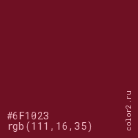 Цвет #6F1023 в цветовой модели RGB обозначается тремя октетами (111, 16, 35) в десятичном формате и #6F1023 в шестнадцатиричном (hex) формате, которые являются интенсивностью красного 111 (hex 6F), интенсивность зелёного 16 (hex 10) и интенсивность синего 35 (hex 23).