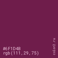 Цвет #6F1D4B в цветовой модели RGB обозначается тремя октетами (111, 29, 75) в десятичном формате и #6F1D4B в шестнадцатиричном (hex) формате, которые являются интенсивностью красного 111 (hex 6F), интенсивность зелёного 29 (hex 1D) и интенсивность синего 75 (hex 4B).