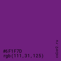 Цвет #6F1F7D в цветовой модели RGB обозначается тремя октетами (111, 31, 125) в десятичном формате и #6F1F7D в шестнадцатиричном (hex) формате, которые являются интенсивностью красного 111 (hex 6F), интенсивность зелёного 31 (hex 1F) и интенсивность синего 125 (hex 7D).
