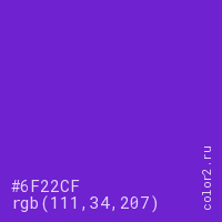 Цвет #6F22CF в цветовой модели RGB обозначается тремя октетами (111, 34, 207) в десятичном формате и #6F22CF в шестнадцатиричном (hex) формате, которые являются интенсивностью красного 111 (hex 6F), интенсивность зелёного 34 (hex 22) и интенсивность синего 207 (hex CF).