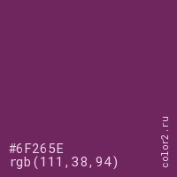 Цвет #6F265E в цветовой модели RGB обозначается тремя октетами (111, 38, 94) в десятичном формате и #6F265E в шестнадцатиричном (hex) формате, которые являются интенсивностью красного 111 (hex 6F), интенсивность зелёного 38 (hex 26) и интенсивность синего 94 (hex 5E).