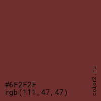 Цвет #6F2F2F в цветовой модели RGB обозначается тремя октетами (111, 47, 47) в десятичном формате и #6F2F2F в шестнадцатиричном (hex) формате, которые являются интенсивностью красного 111 (hex 6F), интенсивность зелёного 47 (hex 2F) и интенсивность синего 47 (hex 2F).