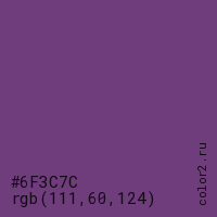 Цвет #6F3C7C в цветовой модели RGB обозначается тремя октетами (111, 60, 124) в десятичном формате и #6F3C7C в шестнадцатиричном (hex) формате, которые являются интенсивностью красного 111 (hex 6F), интенсивность зелёного 60 (hex 3C) и интенсивность синего 124 (hex 7C).