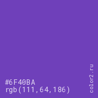 Цвет #6F40BA в цветовой модели RGB обозначается тремя октетами (111, 64, 186) в десятичном формате и #6F40BA в шестнадцатиричном (hex) формате, которые являются интенсивностью красного 111 (hex 6F), интенсивность зелёного 64 (hex 40) и интенсивность синего 186 (hex BA).