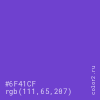 Цвет #6F41CF в цветовой модели RGB обозначается тремя октетами (111, 65, 207) в десятичном формате и #6F41CF в шестнадцатиричном (hex) формате, которые являются интенсивностью красного 111 (hex 6F), интенсивность зелёного 65 (hex 41) и интенсивность синего 207 (hex CF).