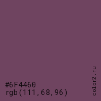 Цвет #6F4460 в цветовой модели RGB обозначается тремя октетами (111, 68, 96) в десятичном формате и #6F4460 в шестнадцатиричном (hex) формате, которые являются интенсивностью красного 111 (hex 6F), интенсивность зелёного 68 (hex 44) и интенсивность синего 96 (hex 60).