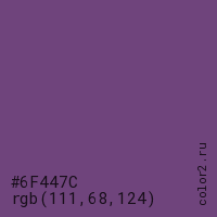 Цвет #6F447C в цветовой модели RGB обозначается тремя октетами (111, 68, 124) в десятичном формате и #6F447C в шестнадцатиричном (hex) формате, которые являются интенсивностью красного 111 (hex 6F), интенсивность зелёного 68 (hex 44) и интенсивность синего 124 (hex 7C).