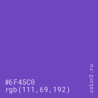 Цвет #6F45C0 в цветовой модели RGB обозначается тремя октетами (111, 69, 192) в десятичном формате и #6F45C0 в шестнадцатиричном (hex) формате, которые являются интенсивностью красного 111 (hex 6F), интенсивность зелёного 69 (hex 45) и интенсивность синего 192 (hex C0).