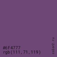 Цвет #6F4777 в цветовой модели RGB обозначается тремя октетами (111, 71, 119) в десятичном формате и #6F4777 в шестнадцатиричном (hex) формате, которые являются интенсивностью красного 111 (hex 6F), интенсивность зелёного 71 (hex 47) и интенсивность синего 119 (hex 77).
