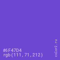 Цвет #6F47D4 в цветовой модели RGB обозначается тремя октетами (111, 71, 212) в десятичном формате и #6F47D4 в шестнадцатиричном (hex) формате, которые являются интенсивностью красного 111 (hex 6F), интенсивность зелёного 71 (hex 47) и интенсивность синего 212 (hex D4).