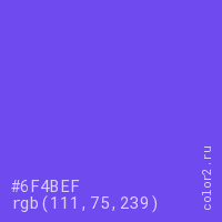 Цвет #6F4BEF в цветовой модели RGB обозначается тремя октетами (111, 75, 239) в десятичном формате и #6F4BEF в шестнадцатиричном (hex) формате, которые являются интенсивностью красного 111 (hex 6F), интенсивность зелёного 75 (hex 4B) и интенсивность синего 239 (hex EF).