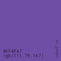 Цвет #6F4FA7 в цветовой модели RGB обозначается тремя октетами (111, 79, 167) в десятичном формате и #6F4FA7 в шестнадцатиричном (hex) формате, которые являются интенсивностью красного 111 (hex 6F), интенсивность зелёного 79 (hex 4F) и интенсивность синего 167 (hex A7).