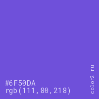 Цвет #6F50DA в цветовой модели RGB обозначается тремя октетами (111, 80, 218) в десятичном формате и #6F50DA в шестнадцатиричном (hex) формате, которые являются интенсивностью красного 111 (hex 6F), интенсивность зелёного 80 (hex 50) и интенсивность синего 218 (hex DA).