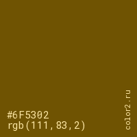 Цвет #6F5302 в цветовой модели RGB обозначается тремя октетами (111, 83, 2) в десятичном формате и #6F5302 в шестнадцатиричном (hex) формате, которые являются интенсивностью красного 111 (hex 6F), интенсивность зелёного 83 (hex 53) и интенсивность синего 2 (hex 02).