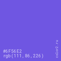 Цвет #6F56E2 в цветовой модели RGB обозначается тремя октетами (111, 86, 226) в десятичном формате и #6F56E2 в шестнадцатиричном (hex) формате, которые являются интенсивностью красного 111 (hex 6F), интенсивность зелёного 86 (hex 56) и интенсивность синего 226 (hex E2).