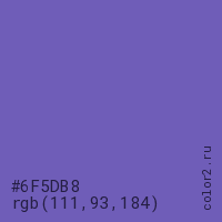 Цвет #6F5DB8 в цветовой модели RGB обозначается тремя октетами (111, 93, 184) в десятичном формате и #6F5DB8 в шестнадцатиричном (hex) формате, которые являются интенсивностью красного 111 (hex 6F), интенсивность зелёного 93 (hex 5D) и интенсивность синего 184 (hex B8).