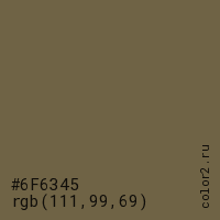 Цвет #6F6345 в цветовой модели RGB обозначается тремя октетами (111, 99, 69) в десятичном формате и #6F6345 в шестнадцатиричном (hex) формате, которые являются интенсивностью красного 111 (hex 6F), интенсивность зелёного 99 (hex 63) и интенсивность синего 69 (hex 45).