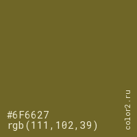 Цвет #6F6627 в цветовой модели RGB обозначается тремя октетами (111, 102, 39) в десятичном формате и #6F6627 в шестнадцатиричном (hex) формате, которые являются интенсивностью красного 111 (hex 6F), интенсивность зелёного 102 (hex 66) и интенсивность синего 39 (hex 27).