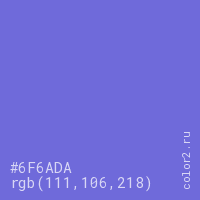 Цвет #6F6ADA в цветовой модели RGB обозначается тремя октетами (111, 106, 218) в десятичном формате и #6F6ADA в шестнадцатиричном (hex) формате, которые являются интенсивностью красного 111 (hex 6F), интенсивность зелёного 106 (hex 6A) и интенсивность синего 218 (hex DA).