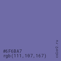 Цвет #6F6BA7 в цветовой модели RGB обозначается тремя октетами (111, 107, 167) в десятичном формате и #6F6BA7 в шестнадцатиричном (hex) формате, которые являются интенсивностью красного 111 (hex 6F), интенсивность зелёного 107 (hex 6B) и интенсивность синего 167 (hex A7).