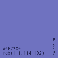 Цвет #6F72C0 в цветовой модели RGB обозначается тремя октетами (111, 114, 192) в десятичном формате и #6F72C0 в шестнадцатиричном (hex) формате, которые являются интенсивностью красного 111 (hex 6F), интенсивность зелёного 114 (hex 72) и интенсивность синего 192 (hex C0).