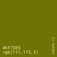Цвет #6F7305 в цветовой модели RGB обозначается тремя октетами (111, 115, 5) в десятичном формате и #6F7305 в шестнадцатиричном (hex) формате, которые являются интенсивностью красного 111 (hex 6F), интенсивность зелёного 115 (hex 73) и интенсивность синего 5 (hex 05).