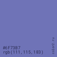 Цвет #6F73B7 в цветовой модели RGB обозначается тремя октетами (111, 115, 183) в десятичном формате и #6F73B7 в шестнадцатиричном (hex) формате, которые являются интенсивностью красного 111 (hex 6F), интенсивность зелёного 115 (hex 73) и интенсивность синего 183 (hex B7).