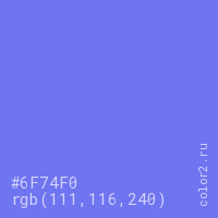 Цвет #6F74F0 в цветовой модели RGB обозначается тремя октетами (111, 116, 240) в десятичном формате и #6F74F0 в шестнадцатиричном (hex) формате, которые являются интенсивностью красного 111 (hex 6F), интенсивность зелёного 116 (hex 74) и интенсивность синего 240 (hex F0).