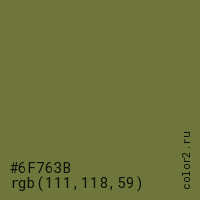Цвет #6F763B в цветовой модели RGB обозначается тремя октетами (111, 118, 59) в десятичном формате и #6F763B в шестнадцатиричном (hex) формате, которые являются интенсивностью красного 111 (hex 6F), интенсивность зелёного 118 (hex 76) и интенсивность синего 59 (hex 3B).
