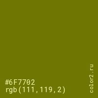 Цвет #6F7702 в цветовой модели RGB обозначается тремя октетами (111, 119, 2) в десятичном формате и #6F7702 в шестнадцатиричном (hex) формате, которые являются интенсивностью красного 111 (hex 6F), интенсивность зелёного 119 (hex 77) и интенсивность синего 2 (hex 02).