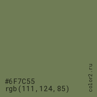 Цвет #6F7C55 в цветовой модели RGB обозначается тремя октетами (111, 124, 85) в десятичном формате и #6F7C55 в шестнадцатиричном (hex) формате, которые являются интенсивностью красного 111 (hex 6F), интенсивность зелёного 124 (hex 7C) и интенсивность синего 85 (hex 55).