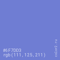 Цвет #6F7DD3 в цветовой модели RGB обозначается тремя октетами (111, 125, 211) в десятичном формате и #6F7DD3 в шестнадцатиричном (hex) формате, которые являются интенсивностью красного 111 (hex 6F), интенсивность зелёного 125 (hex 7D) и интенсивность синего 211 (hex D3).