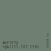 Цвет #6F7F72 в цветовой модели RGB обозначается тремя октетами (111, 127, 114) в десятичном формате и #6F7F72 в шестнадцатиричном (hex) формате, которые являются интенсивностью красного 111 (hex 6F), интенсивность зелёного 127 (hex 7F) и интенсивность синего 114 (hex 72).