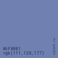 Цвет #6F80B1 в цветовой модели RGB обозначается тремя октетами (111, 128, 177) в десятичном формате и #6F80B1 в шестнадцатиричном (hex) формате, которые являются интенсивностью красного 111 (hex 6F), интенсивность зелёного 128 (hex 80) и интенсивность синего 177 (hex B1).