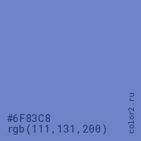Цвет #6F83C8 в цветовой модели RGB обозначается тремя октетами (111, 131, 200) в десятичном формате и #6F83C8 в шестнадцатиричном (hex) формате, которые являются интенсивностью красного 111 (hex 6F), интенсивность зелёного 131 (hex 83) и интенсивность синего 200 (hex C8).