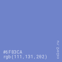 Цвет #6F83CA в цветовой модели RGB обозначается тремя октетами (111, 131, 202) в десятичном формате и #6F83CA в шестнадцатиричном (hex) формате, которые являются интенсивностью красного 111 (hex 6F), интенсивность зелёного 131 (hex 83) и интенсивность синего 202 (hex CA).