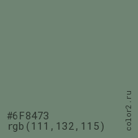 Цвет #6F8473 в цветовой модели RGB обозначается тремя октетами (111, 132, 115) в десятичном формате и #6F8473 в шестнадцатиричном (hex) формате, которые являются интенсивностью красного 111 (hex 6F), интенсивность зелёного 132 (hex 84) и интенсивность синего 115 (hex 73).