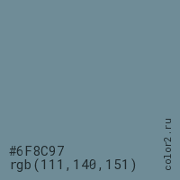 Цвет #6F8C97 в цветовой модели RGB обозначается тремя октетами (111, 140, 151) в десятичном формате и #6F8C97 в шестнадцатиричном (hex) формате, которые являются интенсивностью красного 111 (hex 6F), интенсивность зелёного 140 (hex 8C) и интенсивность синего 151 (hex 97).