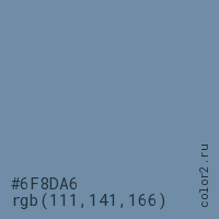 Цвет #6F8DA6 в цветовой модели RGB обозначается тремя октетами (111, 141, 166) в десятичном формате и #6F8DA6 в шестнадцатиричном (hex) формате, которые являются интенсивностью красного 111 (hex 6F), интенсивность зелёного 141 (hex 8D) и интенсивность синего 166 (hex A6).