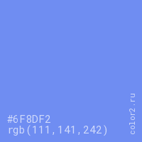 Цвет #6F8DF2 в цветовой модели RGB обозначается тремя октетами (111, 141, 242) в десятичном формате и #6F8DF2 в шестнадцатиричном (hex) формате, которые являются интенсивностью красного 111 (hex 6F), интенсивность зелёного 141 (hex 8D) и интенсивность синего 242 (hex F2).